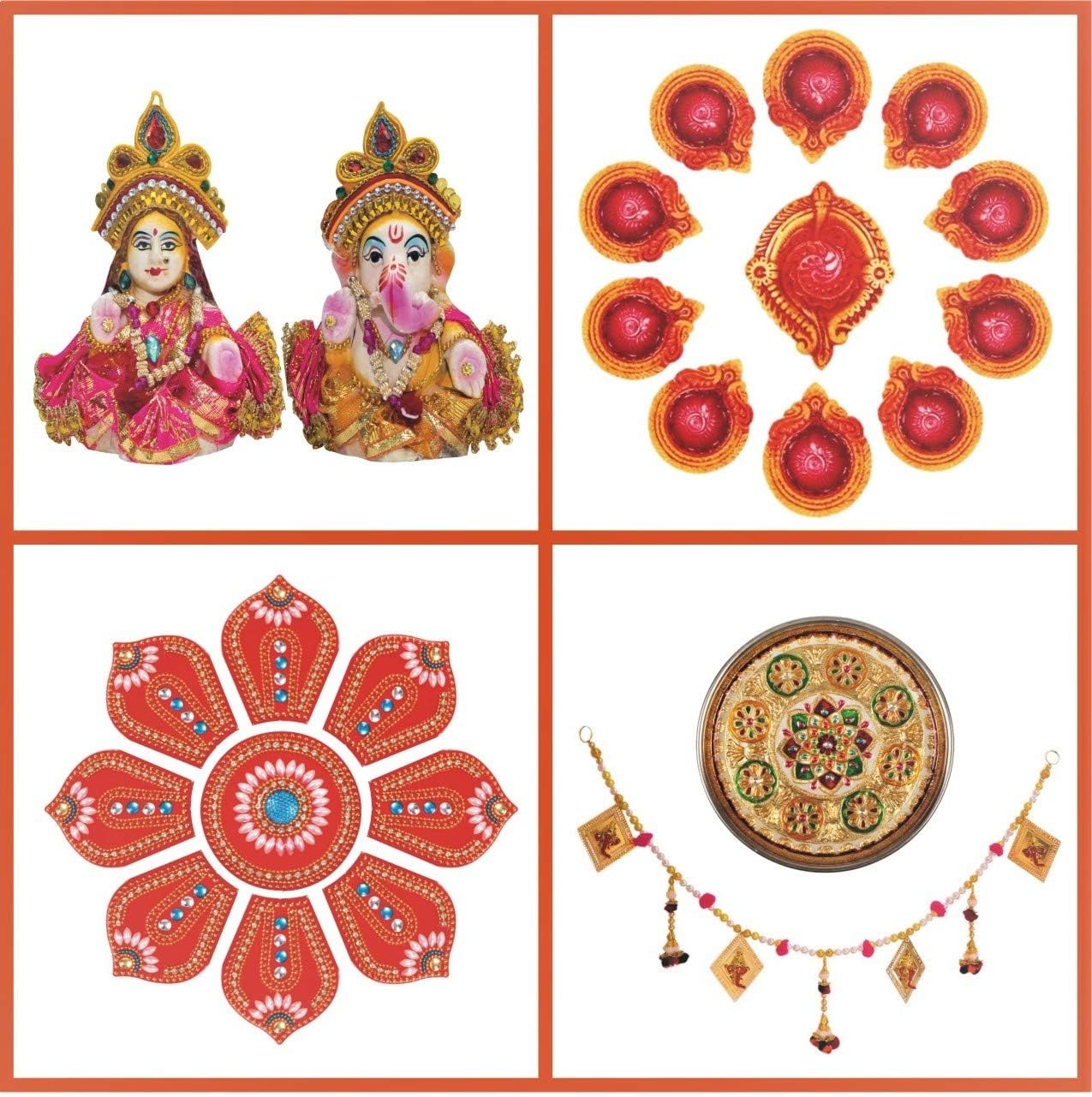 Amazon Com Ramya Pooja Decoration Kit 41 Items Incl Laxmi Ganesh Idols Thali Ghanti Rangoli Bandhanwar Yantras Diyas Gangajal Pooja Material For Navratra Ambe Durga Pooja Diwali Festival Home Kitchen