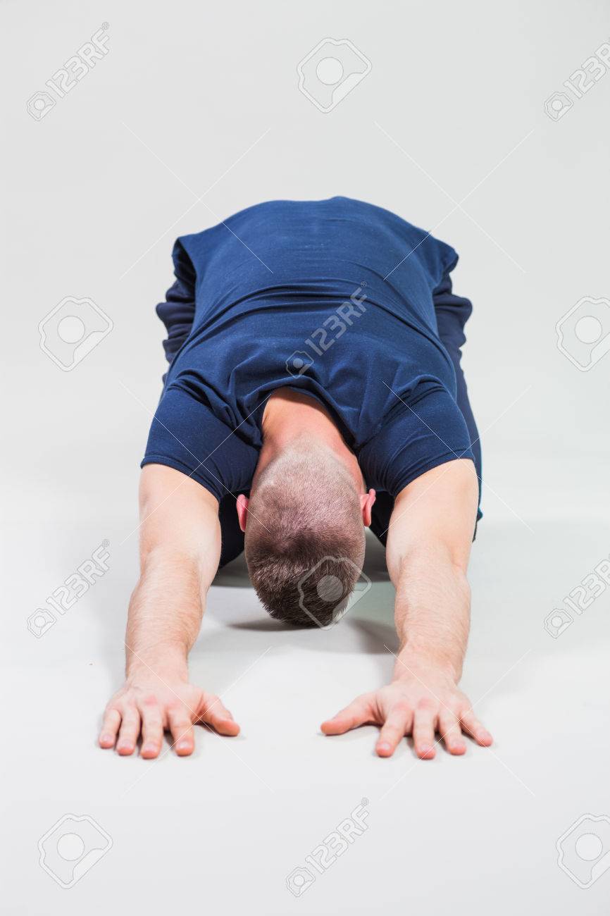 Studio Shot Image Of Young Man Who Is Stretching His Body Shashankasana Stock Photo Picture And Royalty Free Image Image 67986029